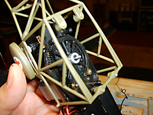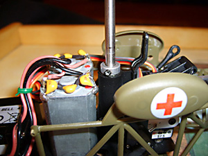 Looking at the Medevac from the rear you can see the two control rods that link the servos to the swashplate. Fig 34 above).The one on the left controls forwards and backwards flight. When the rod moves down the helicopter moves backwards and when it moves up it flys forwards.The rod on the right controls sideways movement. Down = fly right, up fly left. Remember this is when the helicopter is flying tail in to you.So