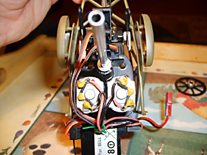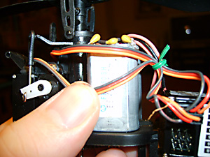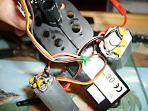 Your model probably had its wires secured together by a plastic tie. This cannot be reused and will have to be cut off carefully, I used a pair of scissors. You can see that I used a bit of green garden wire to do the same job.Ok, let’s take out the servos. There are three screws holding them both in place. One screw is on the right (just visible in between the wires in Fig. 26 and two on the left. The servo wires unplug from the 4 – 1 box, not the servo itself.