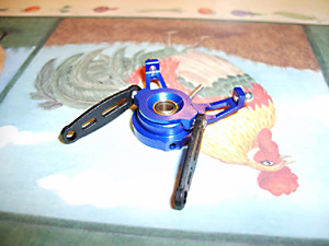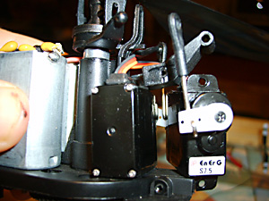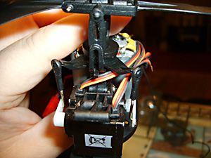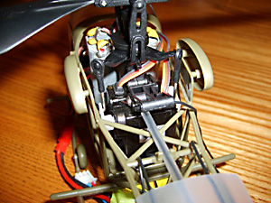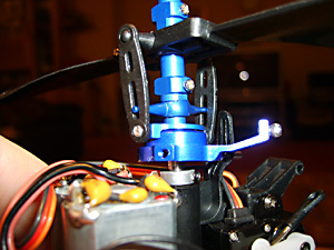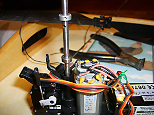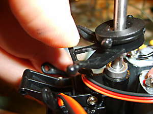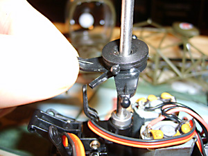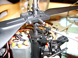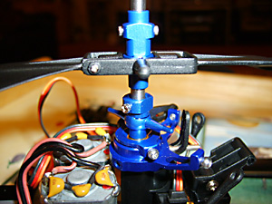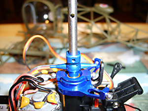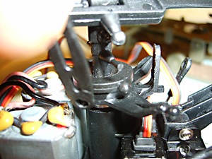 See Fig. 16 and remember you need to screw the top part of the new rotor head into these holes in the main shaft. Before that slide the lower part of the rotor head into place above the swashplate. (See Fig. 35 above).Don’t tighten the lower screws yet.Now put the top part in place and tighten the screws so that they engage in the holes in the shaft. If you tighten them to a point where they just bite, you can feel when they have engaged. Now tighten them in place. You can see in Fig. 36 (above) that the swashplate is sitting slightly above the collar that retains the outer shaft in place. This is important.Now turn the lower part of the rotor head so that the bars are 90 degrees to the rotor blade arms. It probably helps to attach the links at this point and then finally tighten the two retaining screws. Fitting the Heatsink
