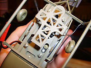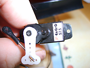 When re-fitting the servos, note how the arm that you thread the aerial through engages with the lug on the right servo. The screw passes through the arm, through the servo lug, then screws into the frame. (See Fig. 29, 30 & 31).