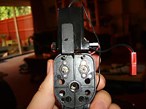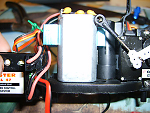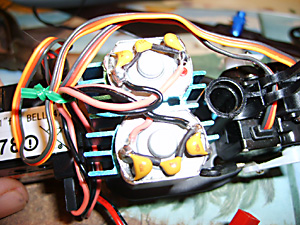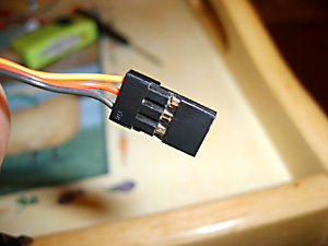 First let’s note how the servos are wired up. When viewed from behind the model, the left servo plugs into the top socket on the right side of the 4 – 1 box. The right servo plugs into the socket underneath it. Black wires to the rear of the model. (See Fig. 26 & 27 above). There are no catches on the plugs to secure them so they just pull out. If you ever replacing the right servo then you will have to completely remove the lower lug. Have a look at the old one for what needs to be done.
