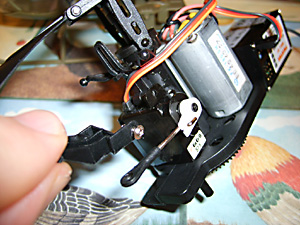 If your replacing the rearmost servo you will need to cut a notch out of the bottom servo lug as shown on in Fig. 32. You don’t need to cut it as close to the hole as this one. If you offer it up first you will see how much you need to trim. This is so it sits flush enough to allow you to engage the lower retaining screw. A very sharp Stanley knife will cut this fairly easily.If it’s a new servo, then you will have to ensure the servo arm is properly set. Unscrew the small black screw holding the arm in place and remove the arm. Now power up your heli as if your going to fly, i.e. with the transmitter on. Ensure all the trim tabs are in their centre positions on the transmitter. Be careful not to move the helicopter until you have the green light on the 4 – 1 box. This will set the servo to its neutral position. Now place the servo arm back in place as it should be when in the neutral position and secure with the screw. (See Fig.33 below).