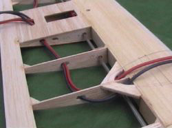 A ply mounting plate takes a 90º-bell crank and is inserted between two outer wing ribs. This bay is then sheeted both on top and underneath the wing. An exit slot is then cut on the underside to accept a wire push rod. The sheathed piano wire push rods return to the centre section where a single standard size servo is mounted to activate the aileron controls. Ailerons are then hinged and added to the wing. All that remains is to cover the wing. This I did using standard Solar Film.